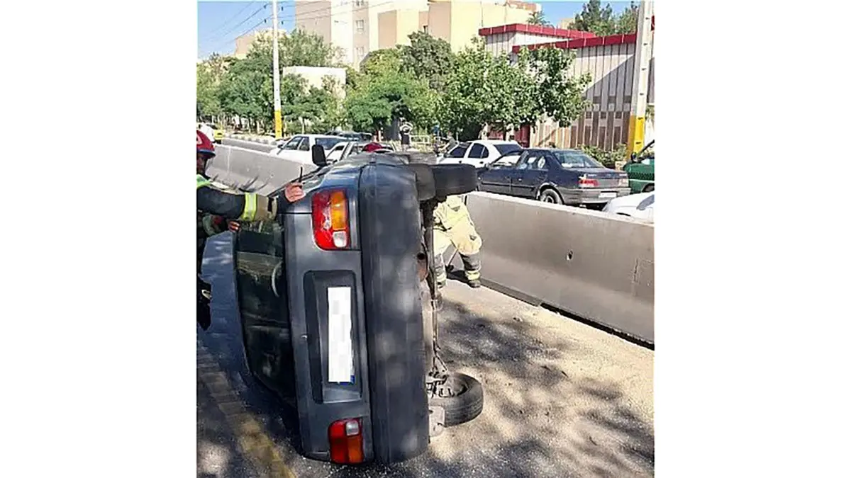 حوادث رکنا: برخورد خودرو سواری با بلوک های سیمانی جداکننده خط ویژه باعث نیمه واژگونی این وسیله نقلیه شد.