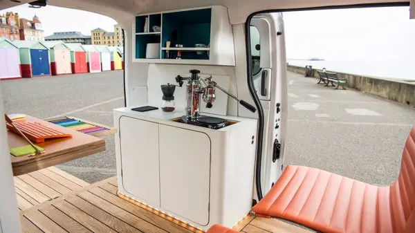 اگر هوا خوب باشد میتوان جفت درهای کشویی طرفین خودرو را به همراه درهای مجزای عقب باز کرد تا فضای کاری بازتری ایجاد شود. در قسمت عقب میتوان یک طبقه هوشمند شناور از داخل خودرو بیرون کشید تا فضای نشستن در هوای آزاد برای تماس تلفنی، کار کردن با لپتاپ یا صرفاً برای لذت بردن از مناظر اطراف ایجاد شود.
