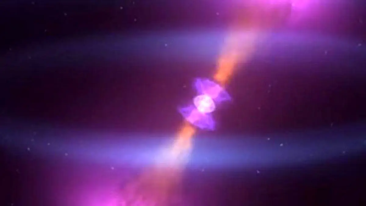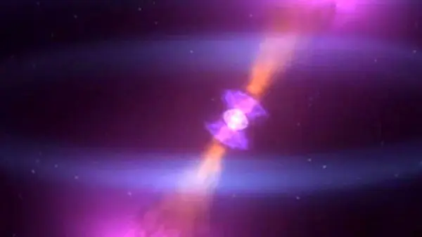 اولین اشعه منتشر شده از این برخورد اشعه گاما است که با رنگ ارغوانی دیده میشود و پس از آن اشعه فرابنفش منتشر میشود که با رنگ بنفش نمایش داده شده است. طول موجهای بعدی در قسمت فروسرخ در فضا پراکنده میشود و با رنگهای آبی و سفید تا قرمز نمایش داده میشود.