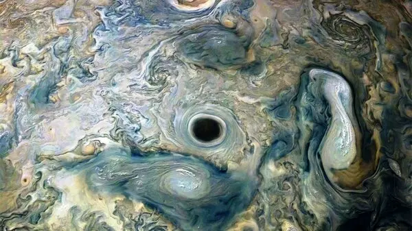 اکنون فضاپیمای جونو تصویر شگفتانگیزی گرفته که نشانگر دایره سیاهی است که بر روی مشتری به دور خودش میچرخد.