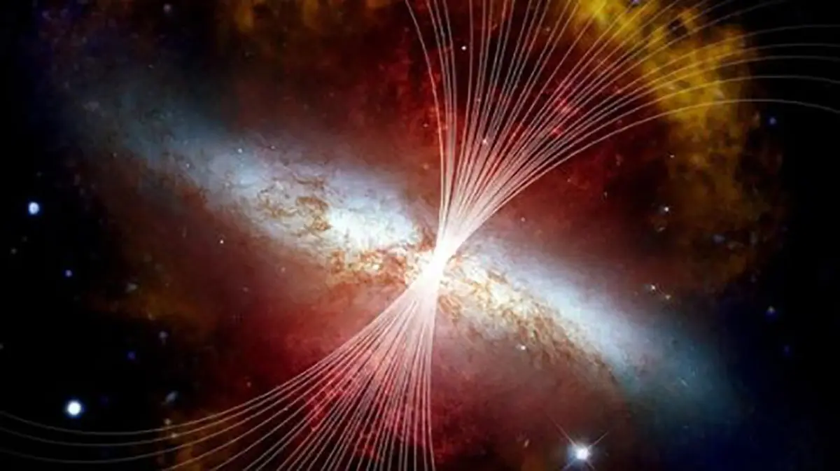 به گزارش رکنا ، میدانهای مغناطیسی کهکشان مسیه ۸۲ یا کهکشان سیگار به صورت خطوطی در نور مرئی در این تصویر ترکیبی فروسرخ که توسط تلسکوپ فضایی هابل ناسا و تلسکوپ فضایی اسپیتزر از این کهکشان ثبت شده، نشان داده شدهاند.
