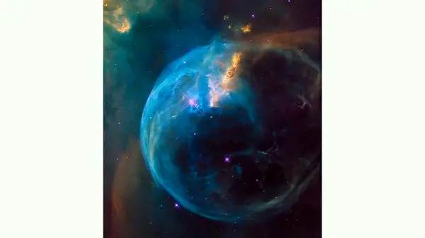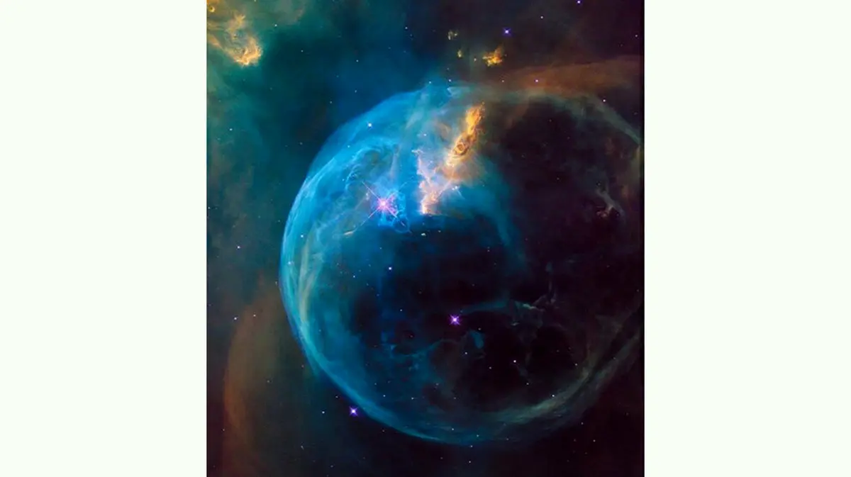 این تصویر نشان دهنده یک ستاره بزرگ است که درون یک حباب گیر افتاده است. ستارهی درون این "سحابی حباب" یک میلیون برابر درخشانتر از خورشید ما است و خروجیهای گازی قدرتمندی تولید میکند که با سرعت بیش از چهار میلیون مایل در ساعت به بیرون از آن جریان دارند.