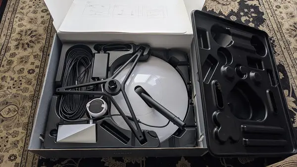 مرحله دوم باز کردن کیت و تجهیزات می باشد. دیش اینترنت استارلینک برخلاف دیش های قبل که که طرح دایره ای داشتند، به شکل چهارگوش می باشند. دیش می تواند بر روی سقف و زمین قرار بگیرد اما نکته مهم نبود سقفی در بالای آن می باشد.