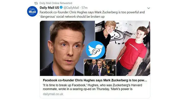رکنا: «کریس هیوز» همکلاسی مارک زاکربرگ و از مؤسسین فیسبوک میگوید زاکربرگ بسیار قدرتمند شده و فیسبوک به دلیل اینکه خطرناک شده، باید نابود شود. وی گفت زمان جدایی فرارسیده است.