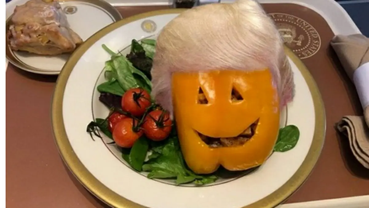 میشل کوچینسکی روزنامه‌نگار آمریکایی در حساب توییتر خود تصاویری را از شام هالووینی که در هواپیمای ترامپ سرو شد، منتشر کرد. این خبرنگار که به همراه چند تن دیگر از همکاران خود در هواپیمای ریاست جمهوری آمریکا عازم شیکاگو بودند با غذایی عجیب توسط میهمانداران این هواپیما پذیرایی شدند.