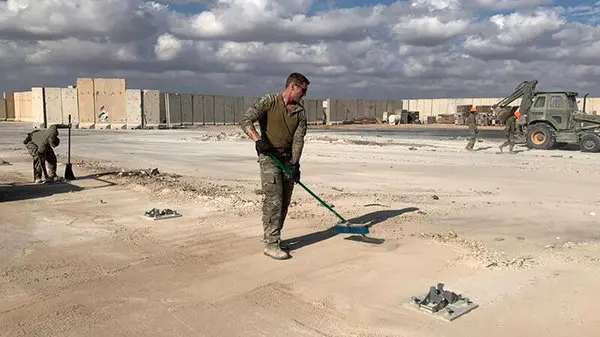 سربازان آمریکایی در میان خرابه‌های پایگاه عین‌الاسد پس از حمله موشکی ایران