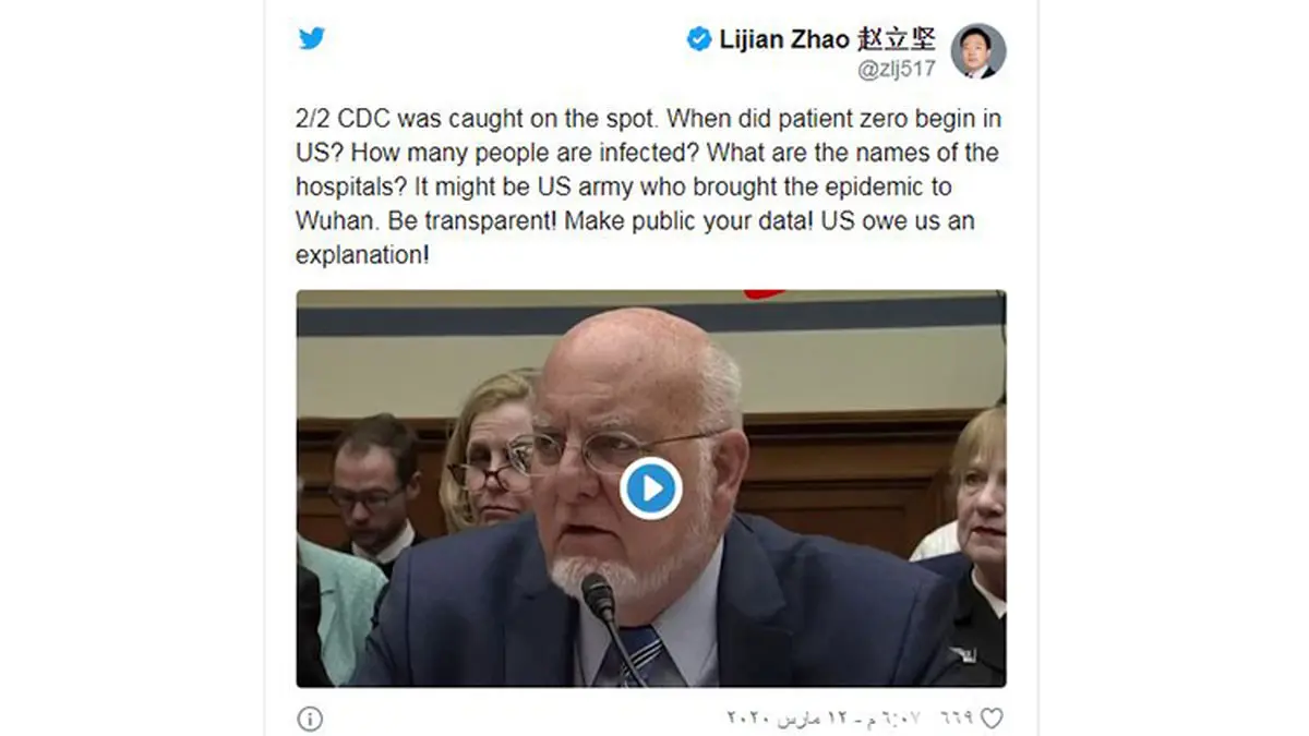 به گزارش رکنا، به نقل از روسیا الیوم، «ژائو لیجیان»، سخنگوی دولت چین در پیامی به زبان انگلیسی در صفحه توئیتر خود نوشت که احتمالا ارتش آمریکا ویروس کرونا را شهر ووهان چین آورده است.