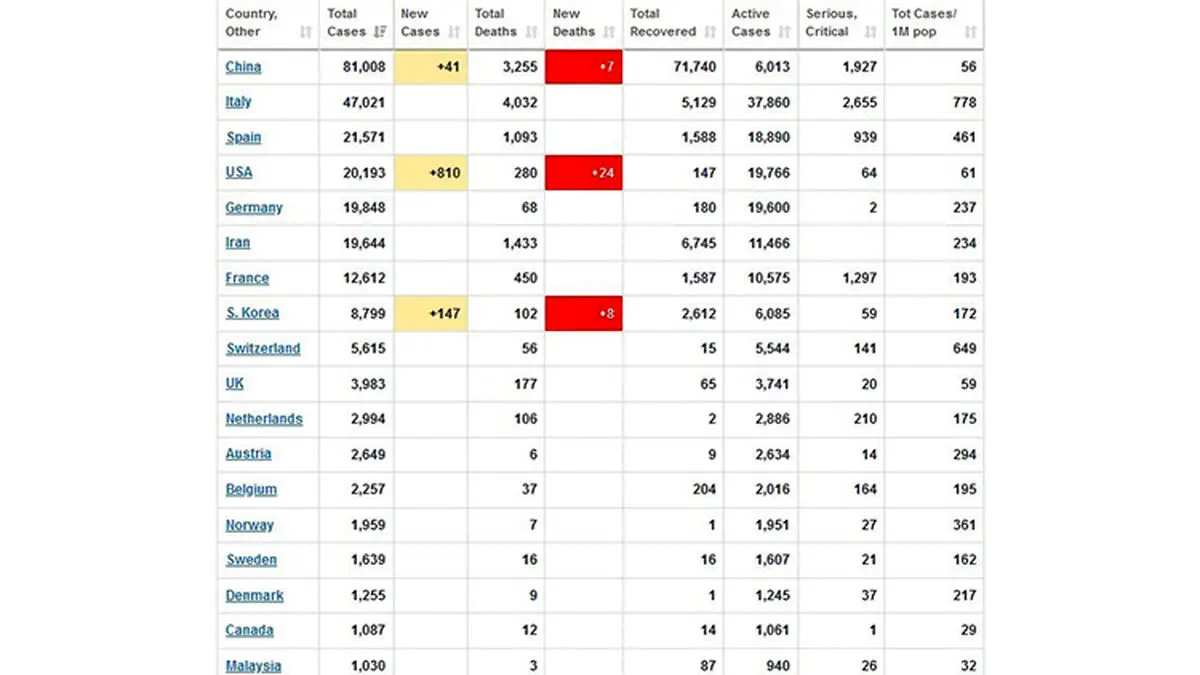 کشور چین به عنوان مبدا شیوه این ویروس با ۸۱ هزار مبتلا در رده کشورهای اول جهان قرار دارد؛ بعد از آن به ترتیب کشورهای ایتالیا، اسپانیا، آمریکا و آلمان در ردههای دوم تا پنجم قرار گرفتهاند.