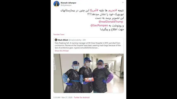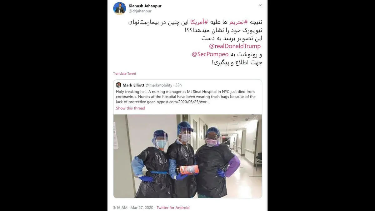 رکنا: کیانوش جهانپور در توییت خود با اشتراکگذاری عکس پرسنل بیمارستانی در نیویورک که کیسه زباله به تن کردهاند، نوشت: «این تصویر برسد به دست ترامپ و پمپئوجهت اطلاع و پیگیری.»
