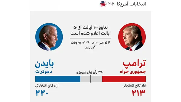 اقتصادی رکنا: برآورد آرای الکترال در ۴۰ ایالت آمریکا نشان میدهد که جو بایدن با احتساب ایالت مینه سوتا تا کنون توانسته ۲۲۰ رای کالج انتخاباتی را کسب کند و دونالد ترامپ ۲۱۳ رای. برای رفتن به کاخسفید رسیدن به حدنصاب ۲۷۰ رای الکترال لازم است.