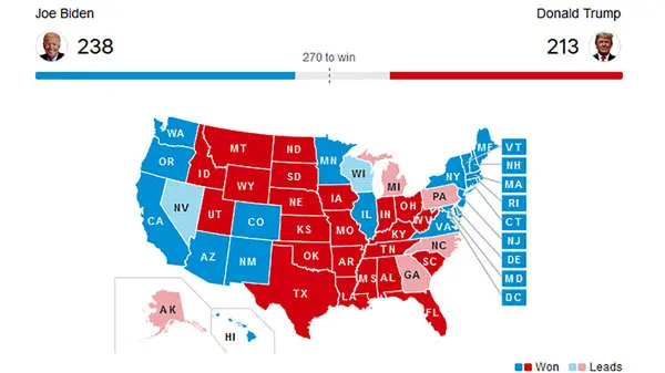 تکلیف رقابت‌های انتخابات ریاست جمهوری آمریکا به ایالات آریزونا، جورجیا، ویسکانسین، میشیگان و پنسیلوانیا بستگی دارد.