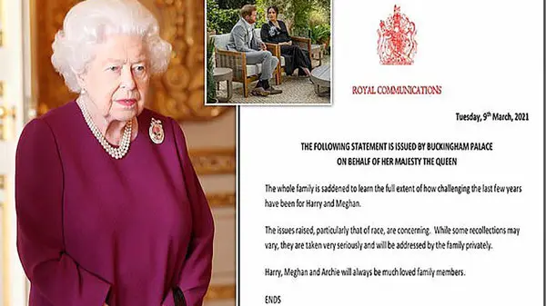 به نوشته روزنامه دیلی میل، در بیانیه کاخ باکینگهام از طرف الیزابت دوم، ملکه بریتانیا آمده است: تمام خانواده از فهمیدن اینکه چند سال گذشته چقدر برای هری و مگان چالشبرانگیز بوده است، متاسف شدند.
