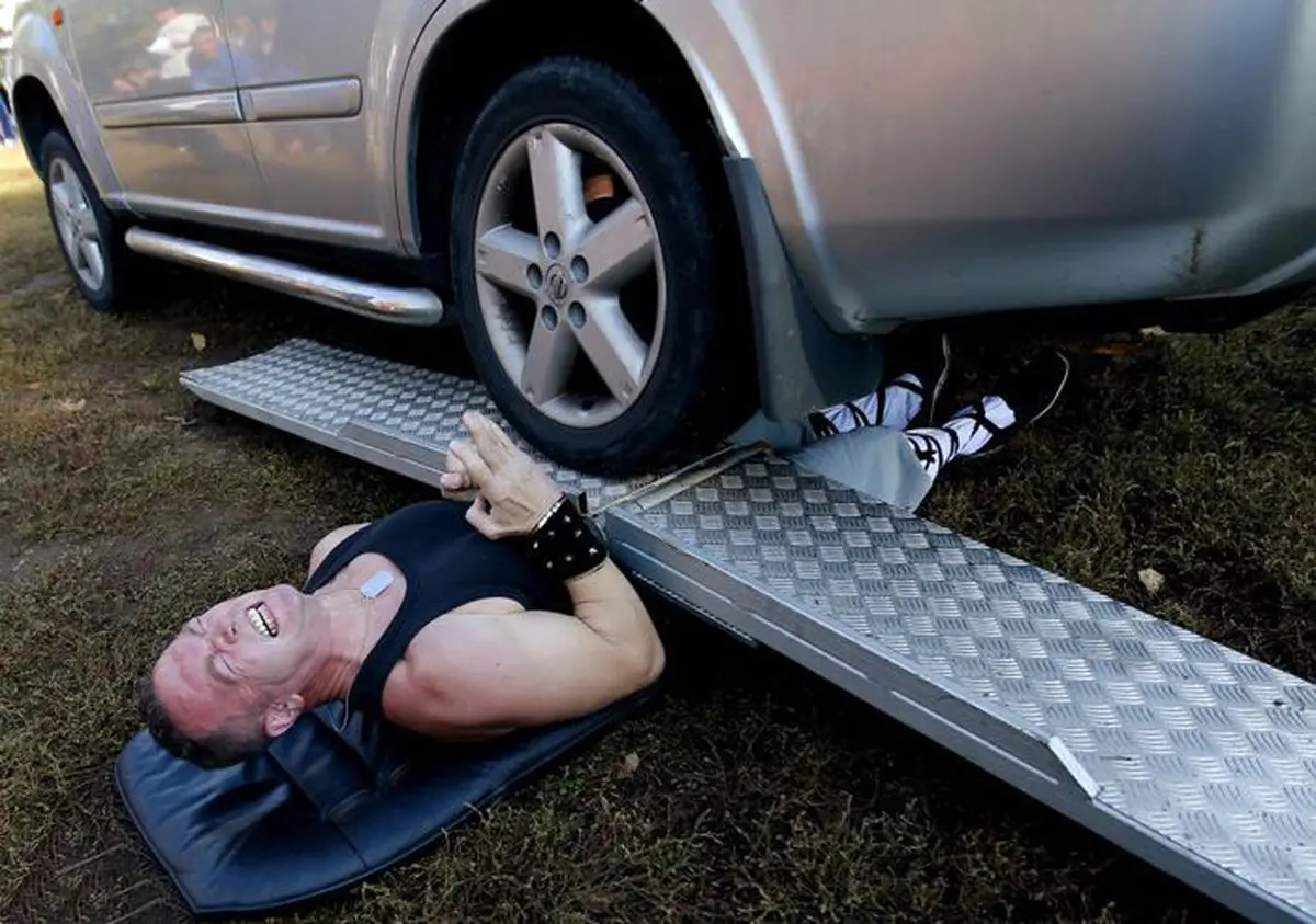 در یکی از دردناک ترین تلاش ها برای رکورد شکنی آتیلا بانایی در یک فستیوال که در بوداپست مجارستان برگزار شده بود اجازه داد یک اتومبیل شاسی بلند روی تمام بدنش بایستد.