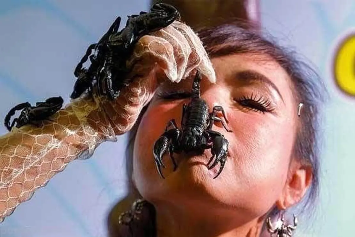 دختر تایلندی در اقدامی وحشتناک عقرب های سمی را روی صورت خود و روی دهان خود آزاد گذاشت تا حرکت کنند که تعجب همه ی را برانگیخت. یک زن نایلندی که به ملکه عقرب ها مشهور هست اقدام عجیبی را انجام داده که در برای دومین بار رکورد دار رکوردهای گینس شده هست.«کانچانا کئتکاو»«Kanchana Kaetkaew» با عقربها در موزه شهر پاتایا در تایلند ژست می گیرد.