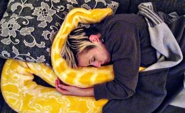 زن و شوهری که به راحتی و بدون هیچگونه ترسی با مار پیتون زندگی بسیار ایده آلی دارند و حتی زن به راحتی شبها در کنار مار می‌خوابد. یک زن و شوهر برای خود یک جانور خانگی کاملا متفاوت و عجیب گزینه کرده اند.جانور خانگی این زوج مار پیتون بزرگ زرد رنگ هست که با انها در یک جا و یک مکان زندگی میکند.