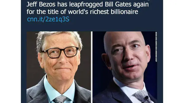 مدیر عامل آمازون با گذشتن از بیل گیتس ثروتمندترین فرد دنیا شد. جف بزوس مدیر وبسایت آمازون با گذشتن از بیل گیتس برای دومین بار پولدارترین فرد دنیا شد.
