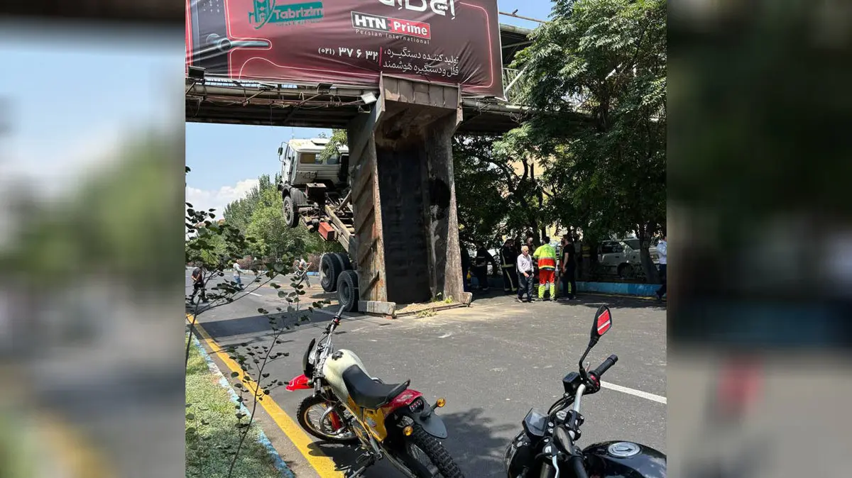 عکس عجیب از گیر کردن کمپرسی در پل هوایی تبریز