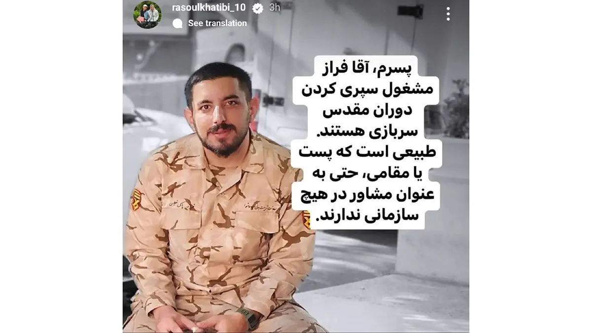 خطیبی در این استوری نوشته است که پسرش در حال حاضر، مشغول سربازی است و نمیتواند که پست یا مقامی به عنوان مشاور در هیچ سازمانی داشته باشد.