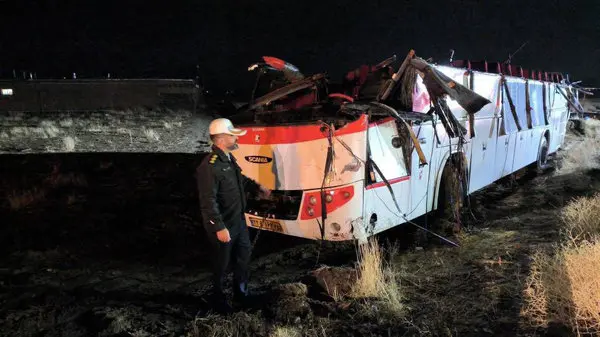 راننده 29 ساله مقصر واژگونی اتوبوس زائران کربلا / تخطی از سرعت مطمئنه و لغزندگی جاده + فیلم و عکس