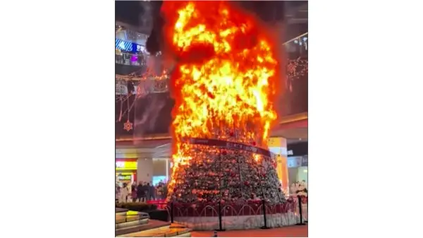 حوادث رکنا: یک کاج کریسمس به ارتفاع ۹ متر در یک مرکز تجاری شهر چنگدو استان سیچوان چین در آتش سوخت.
