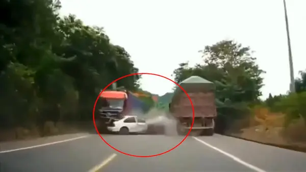 فیلم هولناک از تصادف خودروی لوکس با 2 کامیون در جاده / بین 2 ماشین سنگین پاس کاری شد