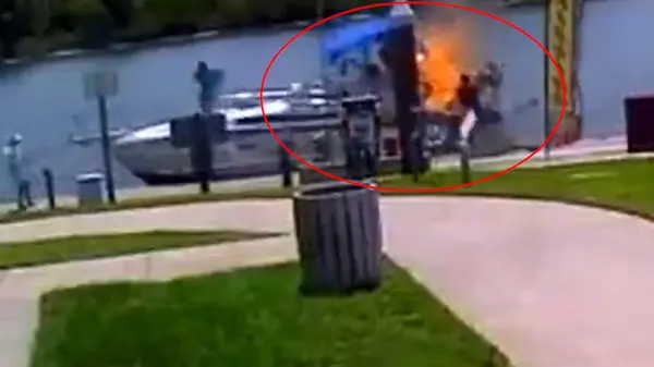 رکنا : دوربین مدار بسته نزدیک یک اسکله تصاویر انفجار یک قایق را ضبط کرده که گویا در حال تعمیرات بوده است.