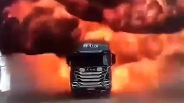 فیلم وحشت آور از انفجار یک تریلی در حال خالی کردن نخاله / راننده سراسیمه از خودرو بیرون پرید