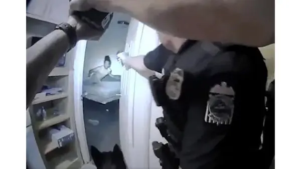 فیلم دوربین بدن یک از افسران لحظات منتهی به حادثه را پس از رسیدن ماموران به آپارتمان نشان میدهد.
