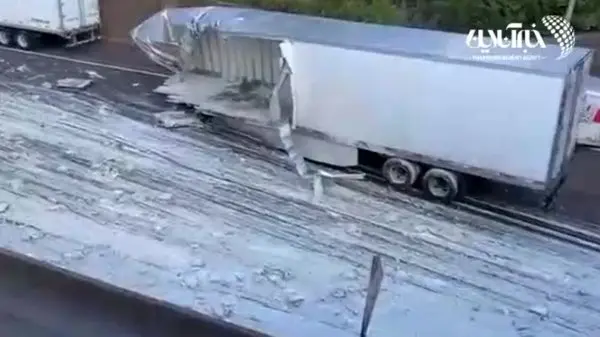 ببینید / اولین فیلم از واژگونی تریلی پر از شیشه سس آلفردو در اتوبان! + فیلم