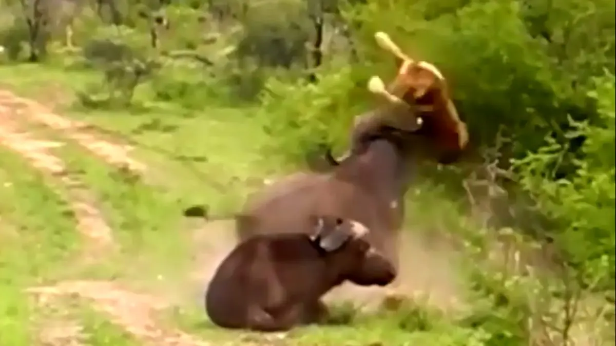 ببینید / تکه‌ پاره کردن شیر جوان و طمعکار توسط گاو غیرتی! +فیلم