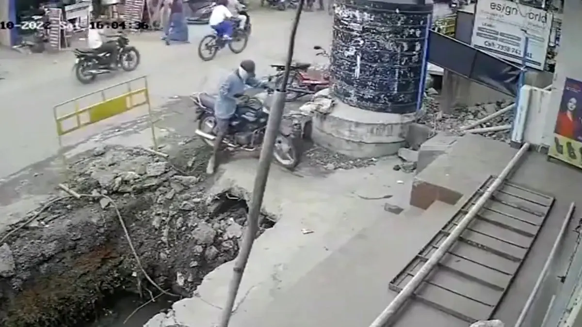 فیلم تکان دهنده از لحظه سقوط مرد موتور سوار به گودال وسط خیابان