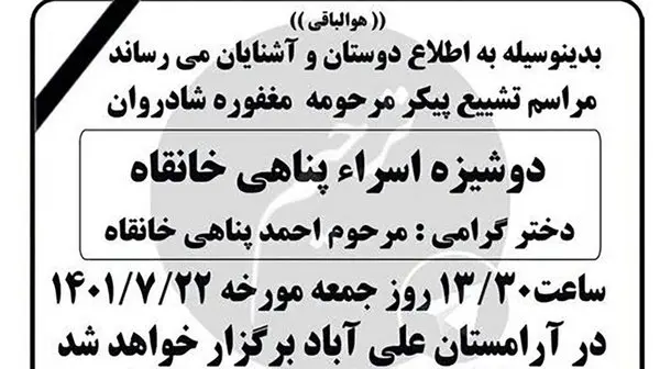 حوادث رکنا: دکتر علی محمدیان اردی اعلام کرد: برابر اسناد پزشکی موجود، وضعیت جسمی اسرا پناهی خانقاه فرزند احمد متولد سال ۱۴ اسفندماه ۱۳۸۵ در ساعت ۶ دقیقه و ۳۷ ثانیه بامداد روز چهارشنبه ۲۰ مهرماه با شماره تلفن همراهی که گویا متعلق به برادر وی بوده، به اورژانس گزارش شده و چند دقیقه بعد توسط اکیپ اورژانس به بیمارستان امام خمینی(ره) انتقال یافته و تحت مداوا قرار گرفته است.