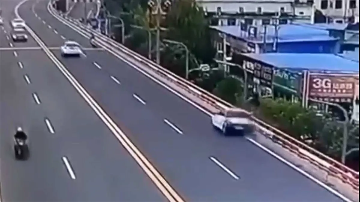 حوادث رکنا: لحظه هولناک تصادف خودروی سواری با دوچرخه و سقوط مرگبار دوچرخهسوار از بالای پل را ببینید. منبع: خبرفوری
