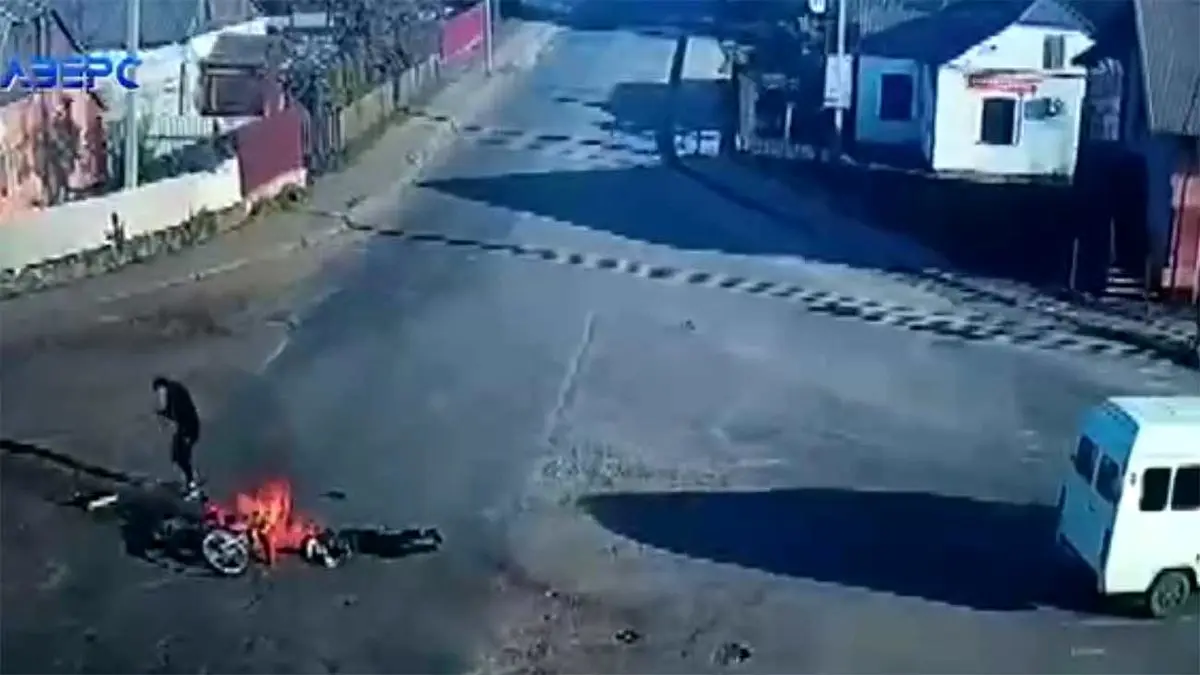 ببینید / تصادف شدید و آتش گرفتن موتورسیکلت در چهارراه / پسر جوان شوکه شد + فیلم