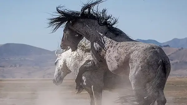 عکسی از یک اسب نر خاکستری در حالی که روی پاهای خود ایستاده و با همتای خود مبارزه می کند توسط یک عکاس ثبت شده است. این اسب نر در نهایت شکست خورد.