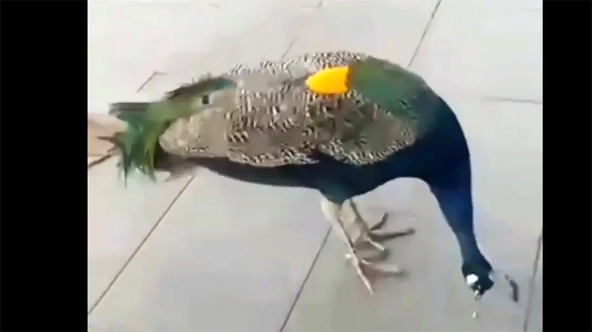 ببینید / لحظه سرقت عجیب یک طاووس شکمو از ظرف غذای یک زن! + فیلم