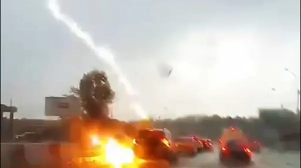 حوادث رکنا: رعد و برق با یک خودرو در حال حرکت در یک اتوبان در یک روز بارانی برخورد کرد.