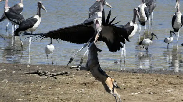 دیان گفت که ما در حال خروج از پارک بودیم که در آخرین ایستگاه برای مشاهده حیوانات و پرندگان توقف کردیم. من در حالی که در حال تماشای فیلها در آب بودم اتفاقی متوجه شدم که یک شغال شدم یک لک لک مارابو را گرفته است.
