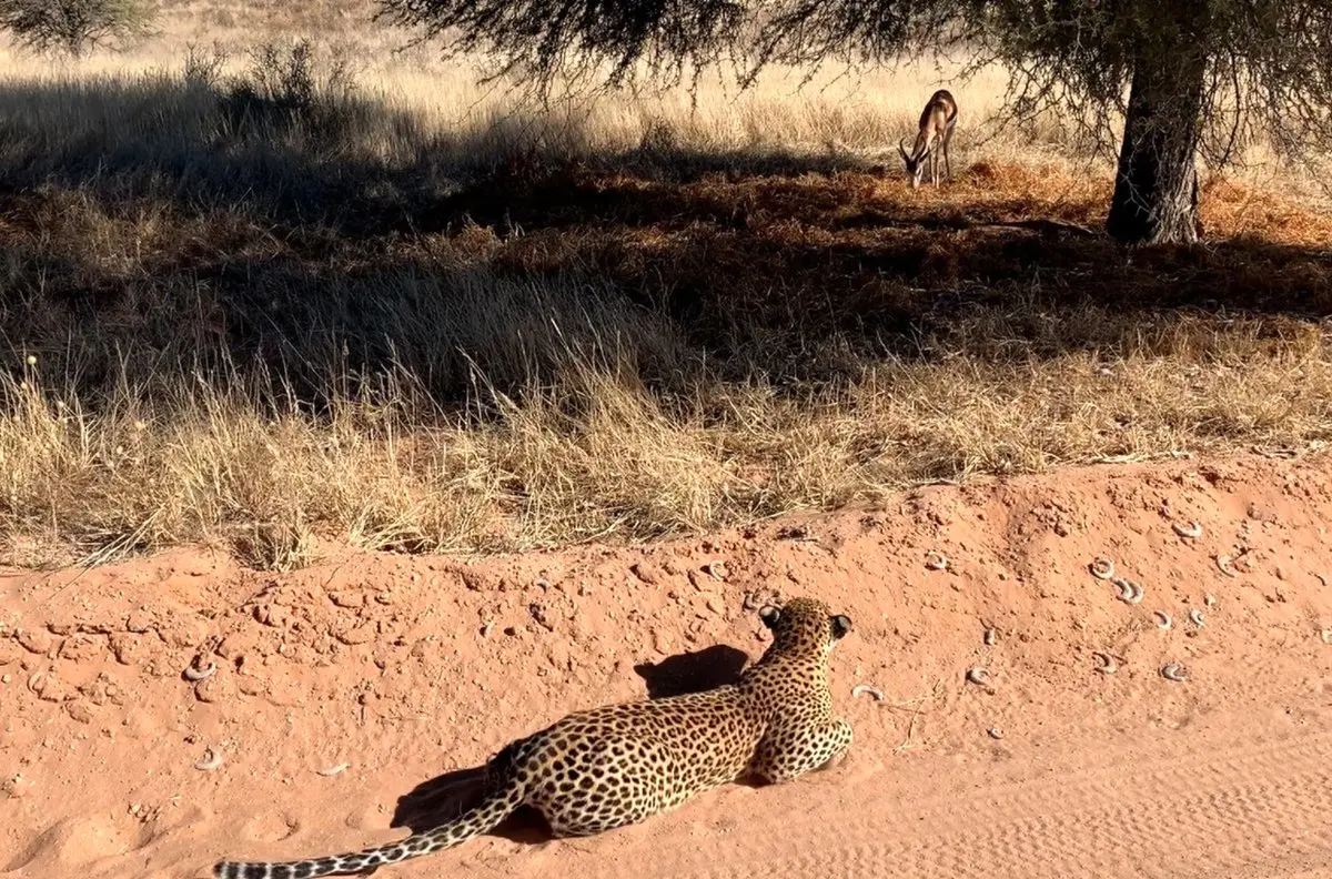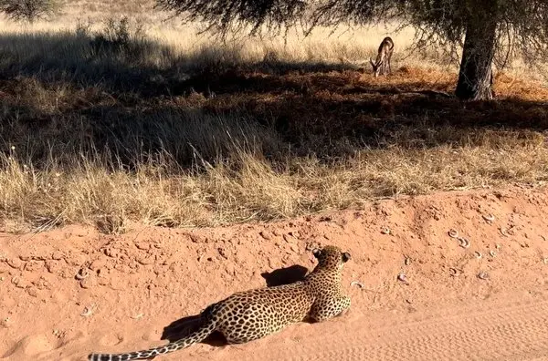 یوهان میگوید: ما ساعت ۱۵ بعد از ظهر به گشت و گذار رفتیم، این ساعت بهترین زمان برای مشاهده پلنگ در کالاهاری است. ما یک پلنگ ماده را در جاده مشاهده کردیم. دراز کشیده و بسیار متمرکز بود.