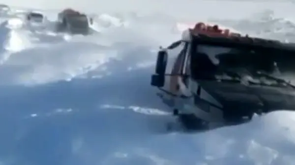 فیلم گرفتار شدن کامیون داران در کولاک برف / خودروها تا کمر در برف گیر کردند