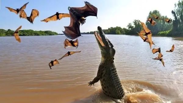 حال تصور کنید در برکهای آرام، کروکودیلهای غول آسایی زندگی میکنند و مترصد هستند تا یکی از این خفاشها را شکار کنند.