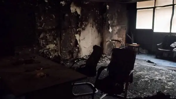 به گزارش مشرق؛ تقریباً تمامی وسایل این دفتر اعم از کتابها، صندلیها، دستگاه فکس، کشوها و میز جلسات، تخته و تصاویر در آتش سوخته و قابل استفاده نیستند.