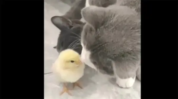 ببینید: / واکنش جالب دو گربه به یک جوجه رنگی! + فیلم احساسی