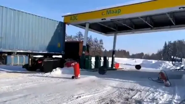 رکنا : کامیون پمپ بنزین را ویران کرد. دلیل این تصادف یخ زدگی خیابان و لیز خوردن کامیون اعلام شده است .