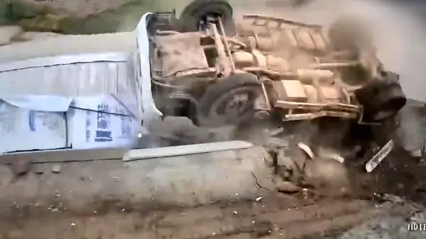 فیلم واژگون شدن کامیون سیمان ببینید / راننده واقعا ناشی بود