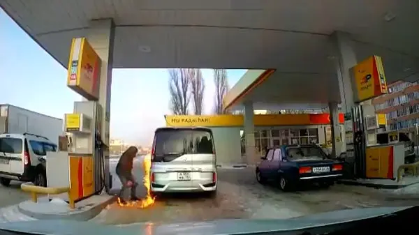بیبینید / شیطنت مرد جوان باعث آتش سوزی خودرویش در پمپ بنزین شد + فیلم