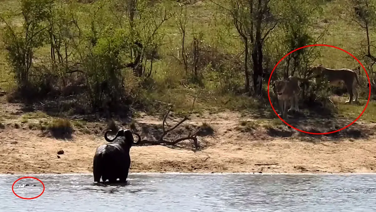 شیرها در کنار آب مشغول استراحت و در کمین بودند تا حیوانهایی که برای آب خوردن میآیند را شکار کنند؛ چه چیزی بهتر از یک گاومیش پیر.
