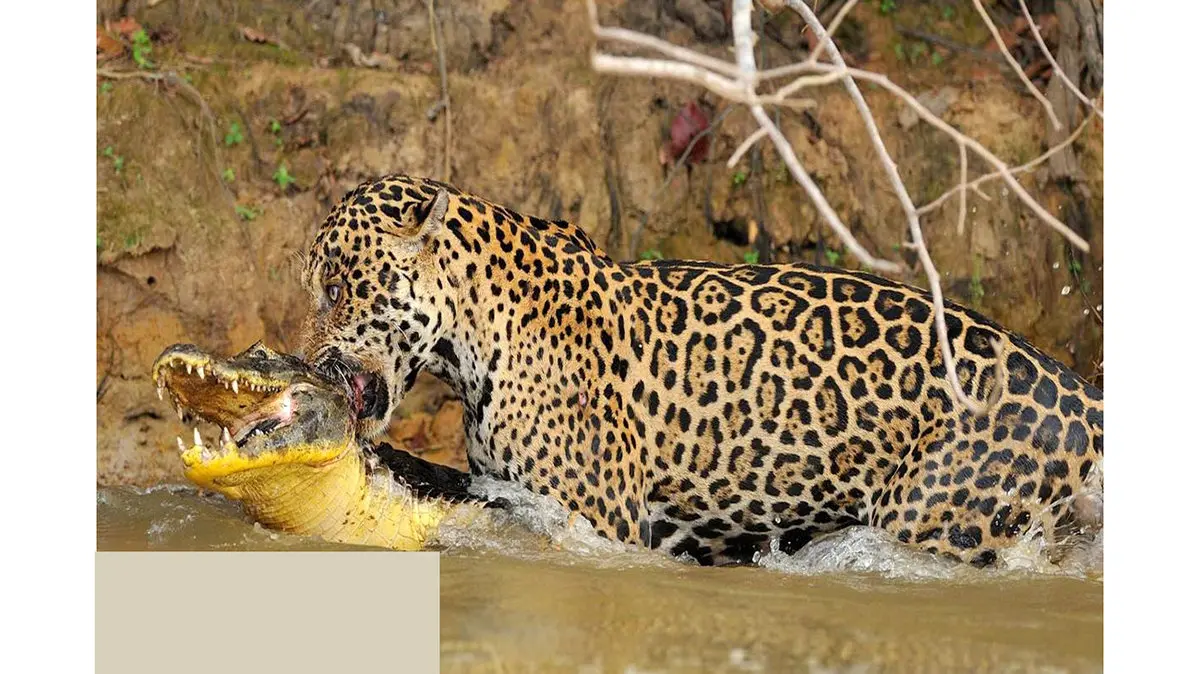 از تفاوت های جگوار و پلنگ که بگذریم در این ویدئوی شگفت انگیز جگوار گرسنه ای را می بینید که برای شکار تمساح به درون آب میپرد و در اتفاقی نادر موفق به شکار تمساح میشود. در پایان ویدیو میبینیم که جگوار با آروارههای قدرتمندش تمساح را از آب بیرون میکِشد.
