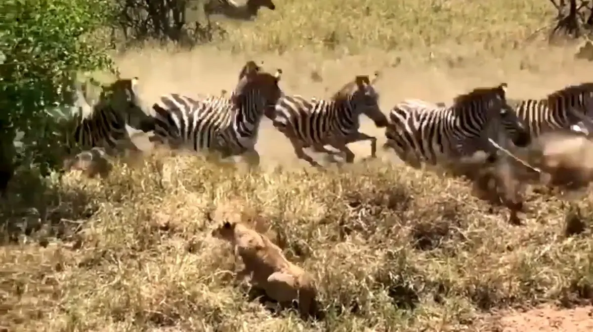 این ویدئو که در ماسایی مارا ضبط شده، کمین یک ماده شیر برای شکار گورخرها را نشان میدهد اما گله گورخرها قصد فرار دارند، اما شیر حواس پرت متوجه حجم عظیم گورخرها نیست و زیر لگد آنها له میشود.