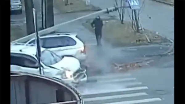 حوادث رکنا: یک عابر پیاده به طور معجزه آسایی از تصادف شدید دو خودرو و سقوط تیر چراغ برق، جان سالم به در برد.مردی در یکی از خیابانهای شهر بسک روسیه، هنگام عبور از یک چهارراه، در چند قدمی خود با تصادف شدید دو خودروی شاسی بلند روبرو شد.